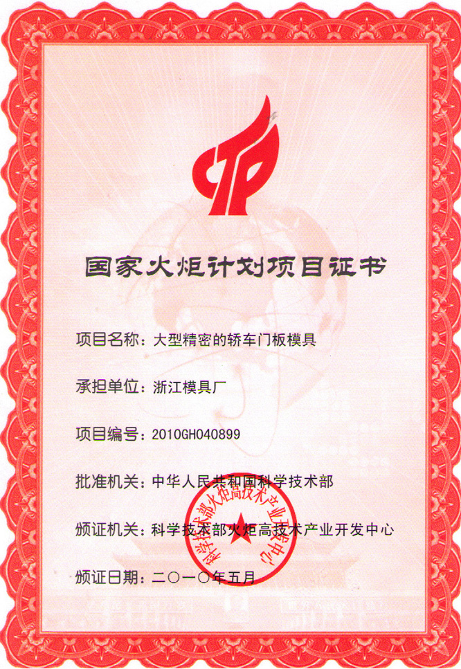 2011年,浙江模具厂自主研发的“大型精密的轿车门板模具”被科技部列入“国家火炬计划项目”。